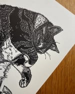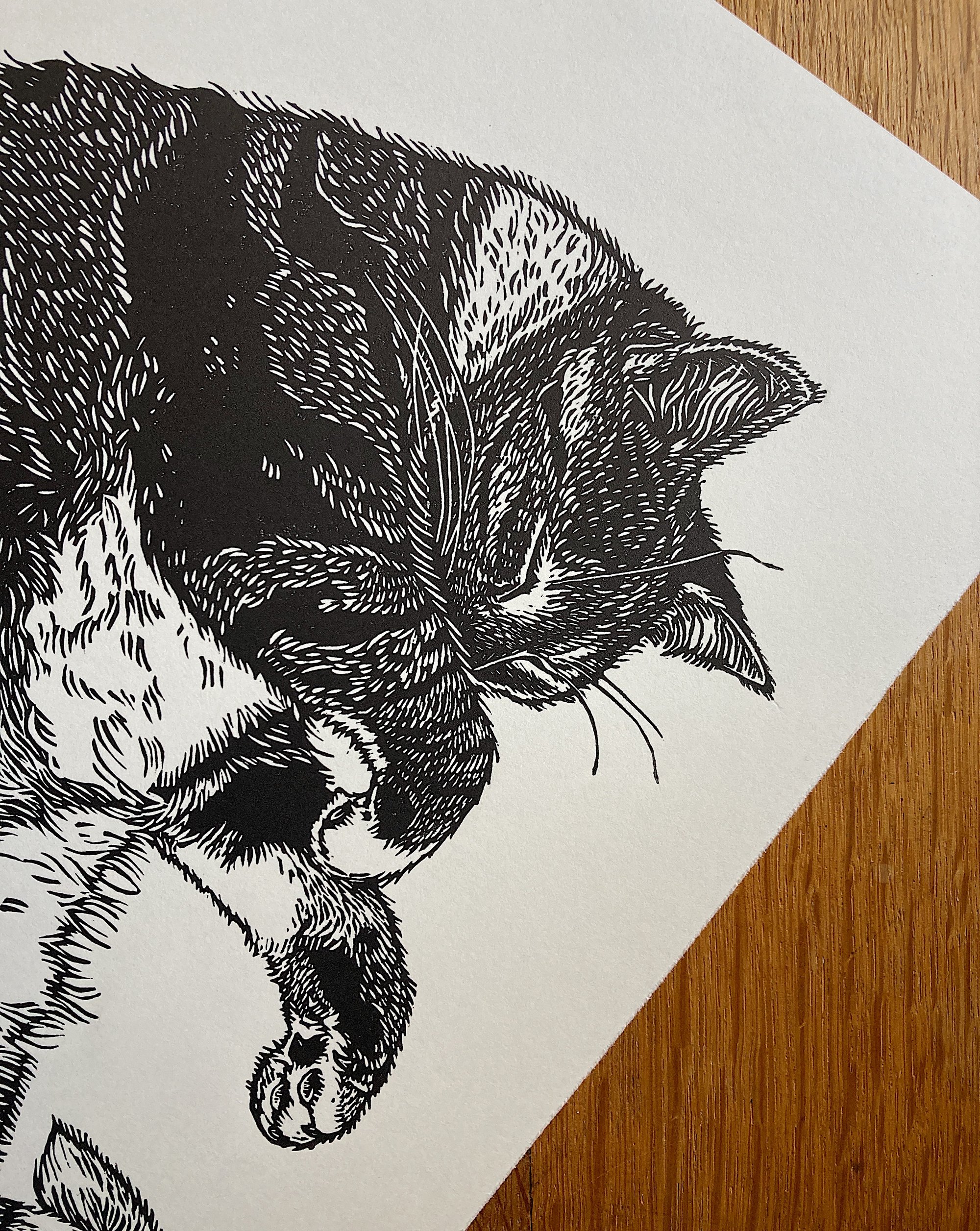 Original lino cut print of a very sleepy and cuddly cat. Based on my mum’s lovely cat Mabel, however it is a pose that all cat owners and lovers will be very familiar with!